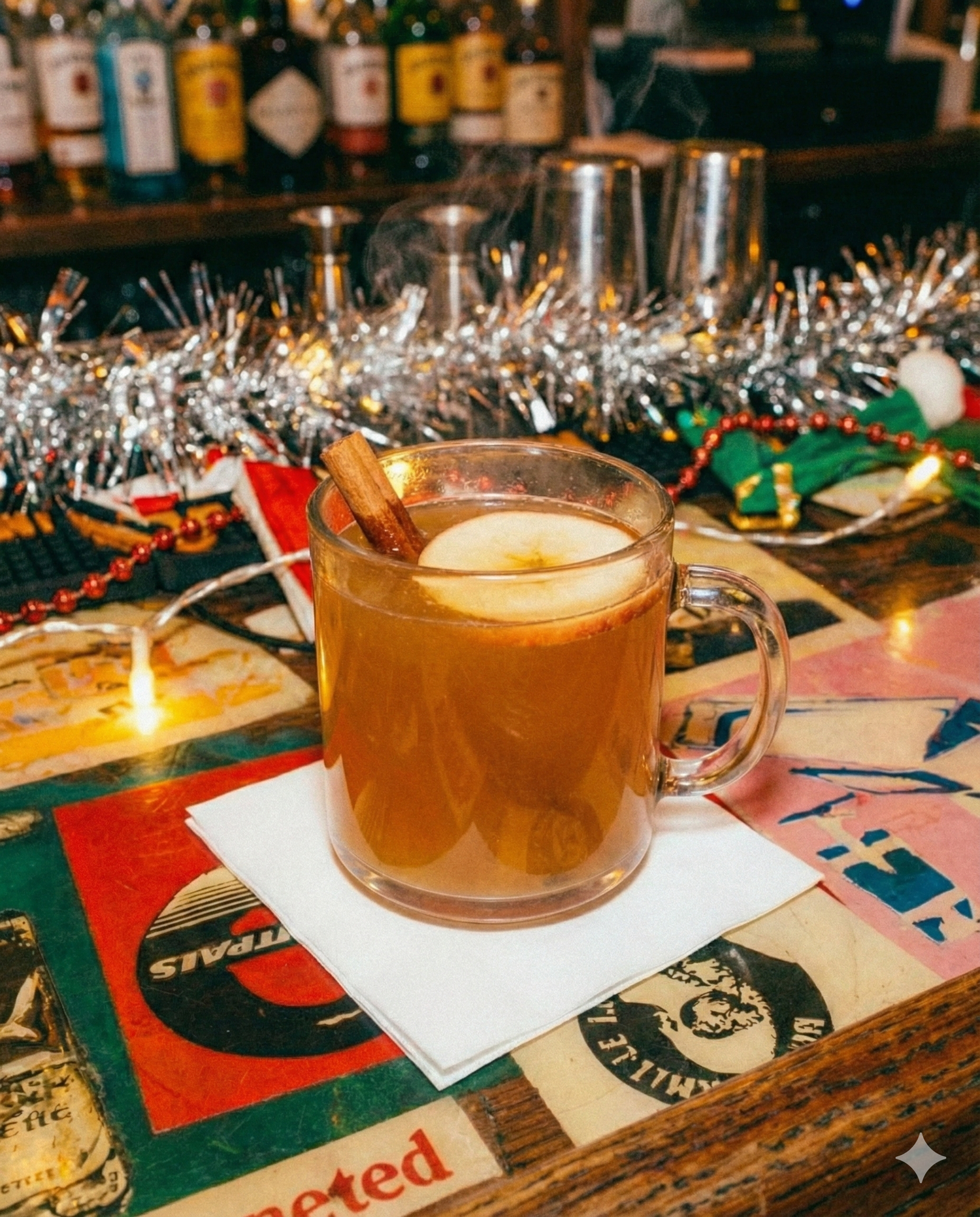 - Garnish with a cinnamon stick and apple slice
